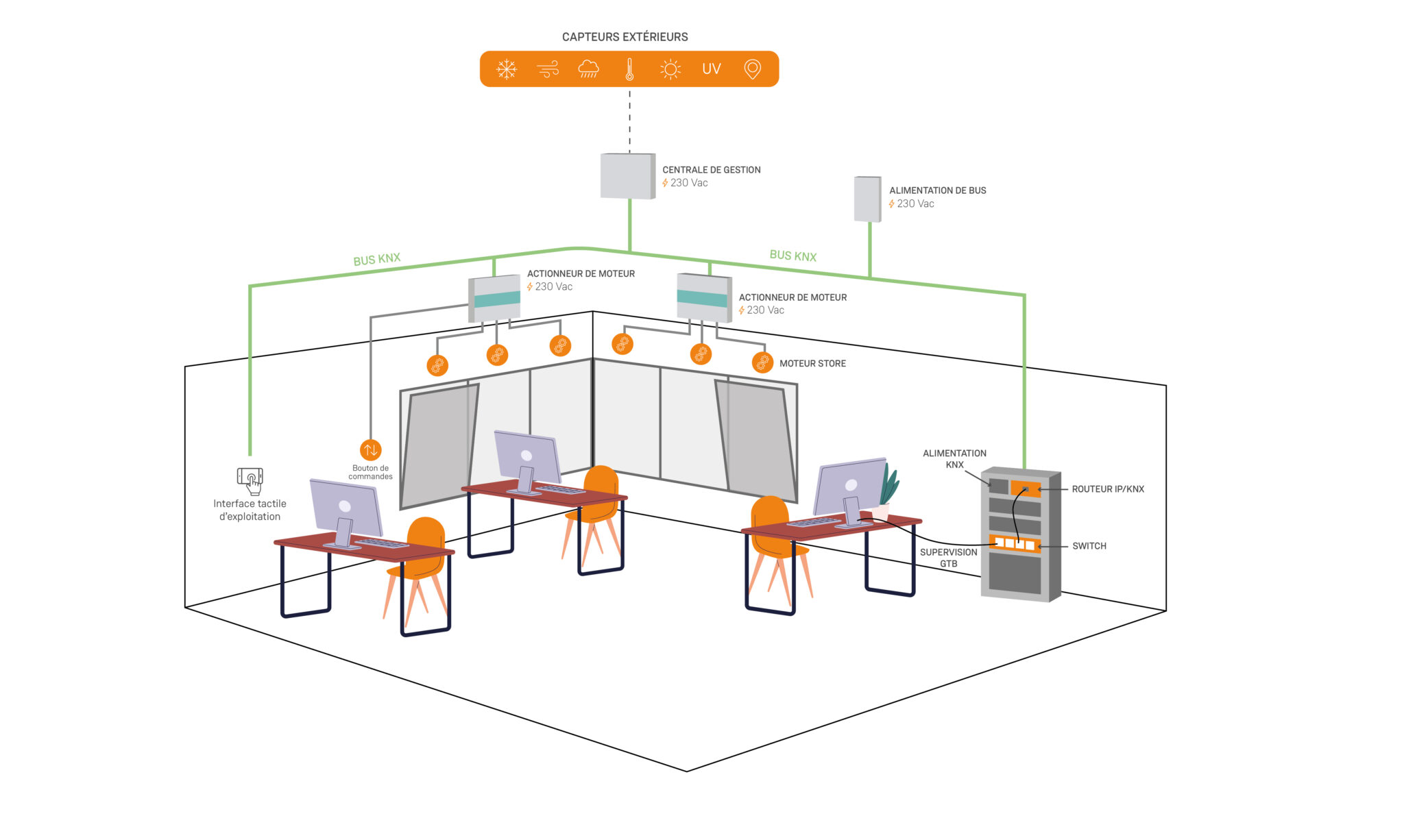 Le système GTB va pouvoir automatiser l’ajustement des stores protections solaires en fonction des données collectées par les capteurs, en définissant différents scénarios selon les besoins des occupants ou les objectifs énergétiques du bâtiment.